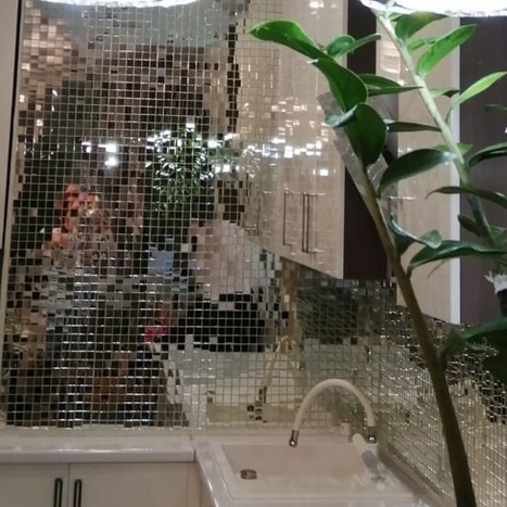 Использовалась серебристая зеркальная плитка формы "вытянутый ромб".