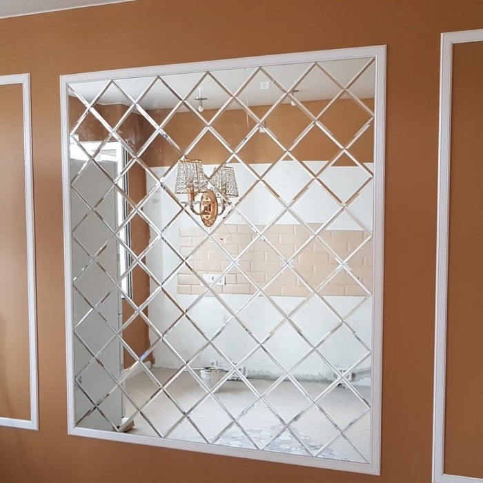 Использована серебристая квадратная зеркальная плитка размером 18х18.