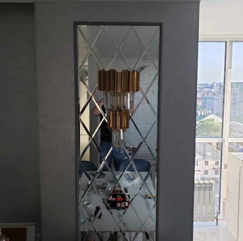 Использована квадратная серебристая зеркальная плитка размером 18х18.